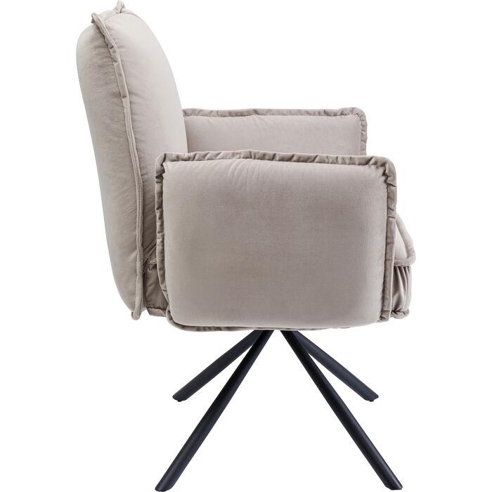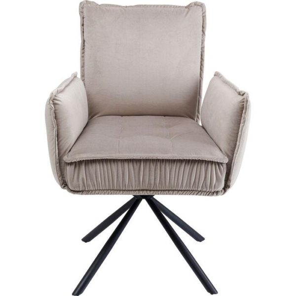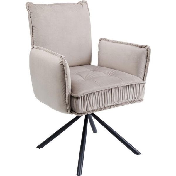 To-tonet polstret stol i brun med armlener og base i svart laget av metall.