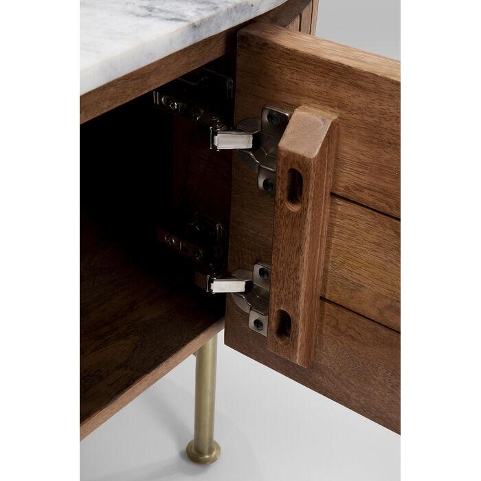 Kombinasjonen av de bearbeidede materialene er et skue i seg selv. Stuemøblene laget av massivt mangotre med marmortopp av høy kvalitet og gyldne ben er full av stil