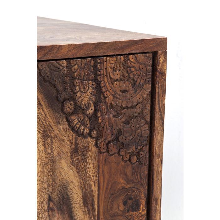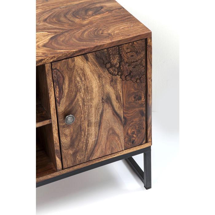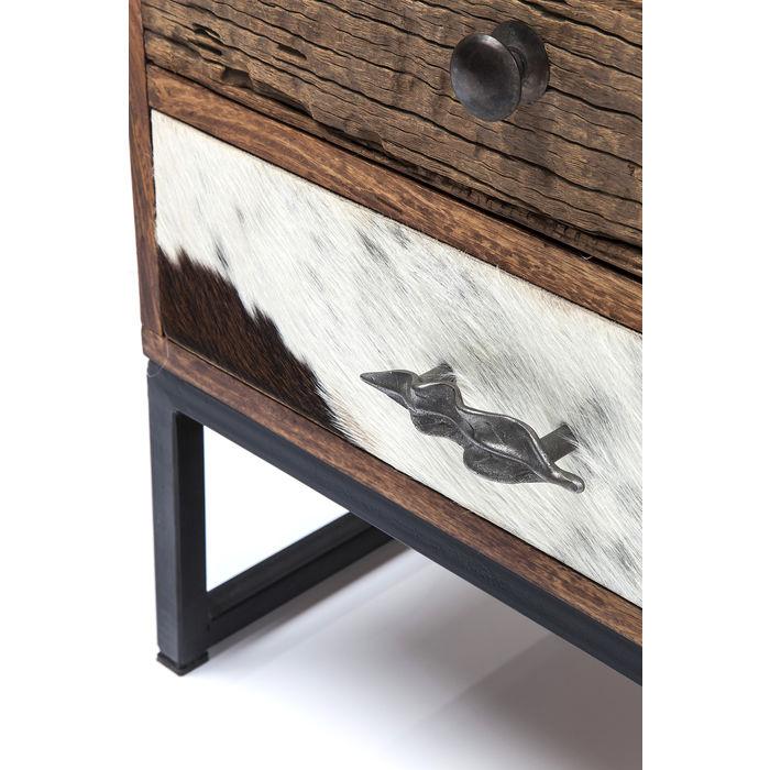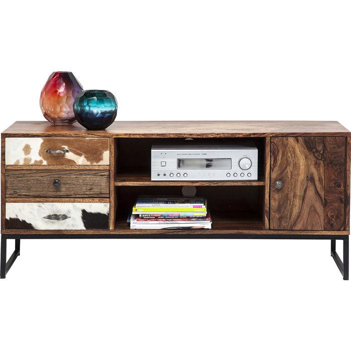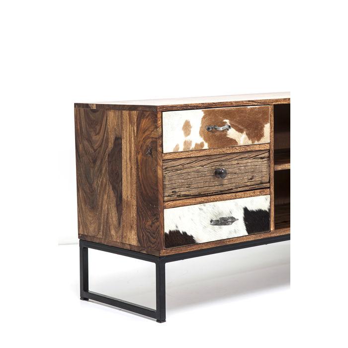 Rodeo Superstar – Inspirasjonen for designerne som skapte dette karakteristiske møbelsortimentet, var duften av fjellskoger oversvømmet av sollys og den varme hygge i et fjellsted. Med sine kuskinntrimler og vakre utskjæringer gir frontene denne serien sin urbane og robuste sjarm. Dette TV-stativet er preget av rene, moderne linjer som kontrasterer harmonisk med det livlige og naturlige Sesam-treverket. Den individuelle designen med ekte hud og intrikate utskjæringer skaper et fascinerende utseende. Hver artikkel er unikt.